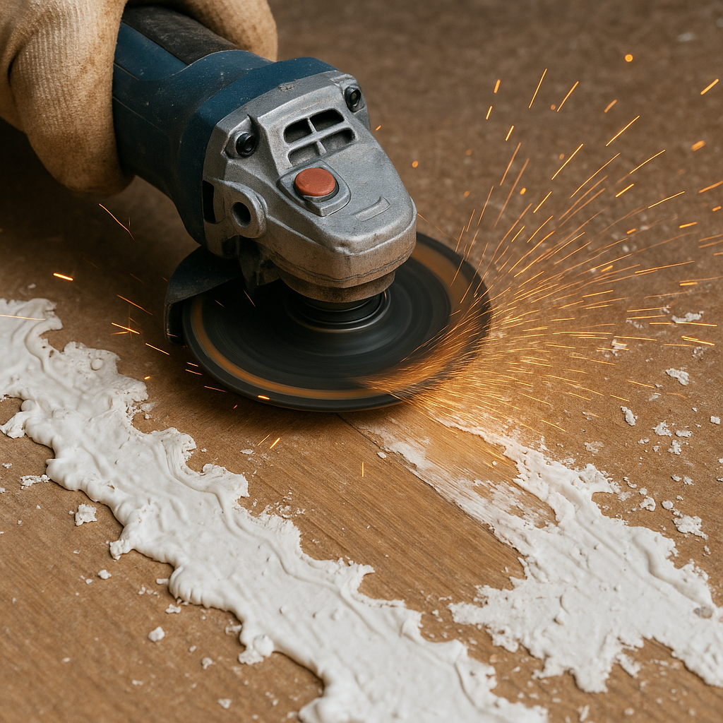 The best removal method depends on the type and thickness of the material you’re working with. For light adhesive or glue residues, grinding is usually sufficient. Thicker or more elastic adhesives, such as carpet glue or mastic, may respond better to a combination of scraping or chemical removal followed by grinding. If the coating is extremely hard or uneven, scabbling or shot blasting may be the most effective solution.